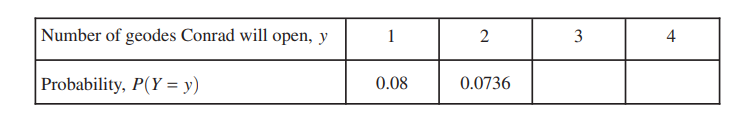 (b) Another player, Conrad, decides to play the game and will stop opening geodes after finding a red crystal or when 4 geodes have been opened, whichever comes first. Let Y = the number of geodes Conrad will open. The table shows the partially completed probability distribution for the random variable Y.