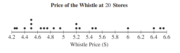 Julio called the managers of 20 randomly selected stores that sell the whistle and recorded the price of the whistle at each store. Following is a dotplot of Julio’s data.