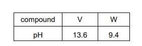 V and W are two compounds. Each one contains a different Group 2 element. A sample of each solid is added to water, shaken, and the pH of the resulting solution is measured.