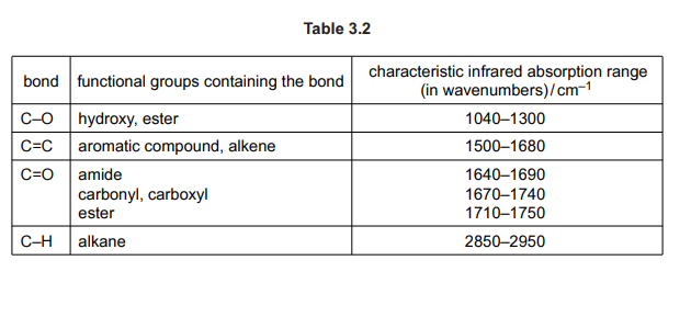 (iv) Reaction 3 is monitored using infrared spectroscopy. It is not possible to use the O—H absorption frequency to monitor the reaction. Use Table 3.2 to identify a suitable bond whose absorption frequency can be used to monitor the progress of reaction 3. State the change you would see in the infrared spectrum during reaction 3.