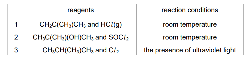 Which sets of reagents and conditions can be used to produce 2-chloro-2-methylpropane as one of the organic products?