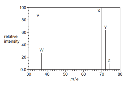 The diagram shows the mass spectrum of a sample of chlorine. Peaks V, W, X, Y and Z are labelled.