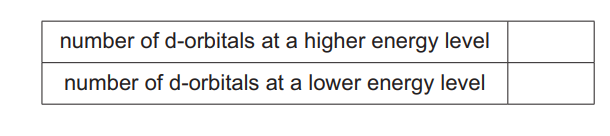 (ii) The d-orbitals of the \(Co^{2+}\) ions present in complex ion G are split. State the number of d-orbitals that are at a higher energy level and the number of d-orbitals that are at a lower energy level in each \(Co^{2+}\) ion.