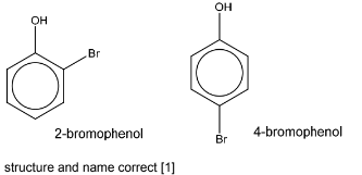 (b) When phenol is reacted with bromine dissolved in an inert solvent, two isomeric bromophenols, C6H4BrOH, are formed.