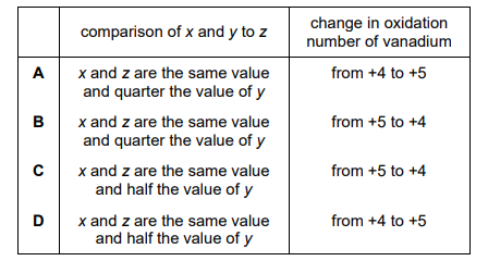 \(2S_2O_3^{2–} + xVO_2^+ + yH^+ \to S_4O_6^{2–} + zVO_2^+ + 2H_2O\)