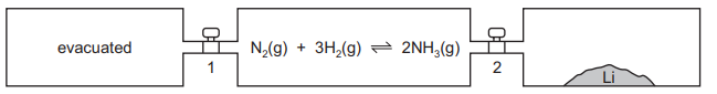 At the start, taps 1 and 2 are closed, the left-hand vessel is evacuated, the middle vessel has the indicated reaction at equilibrium and the right-hand vessel contains lithium only. Which action would allow the equilibrium mixture to contain the most ammonia?