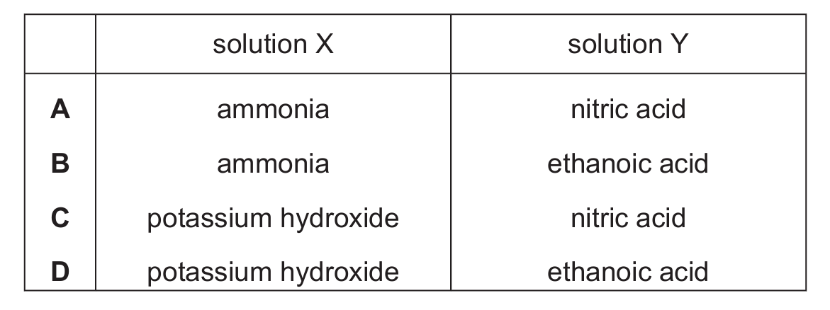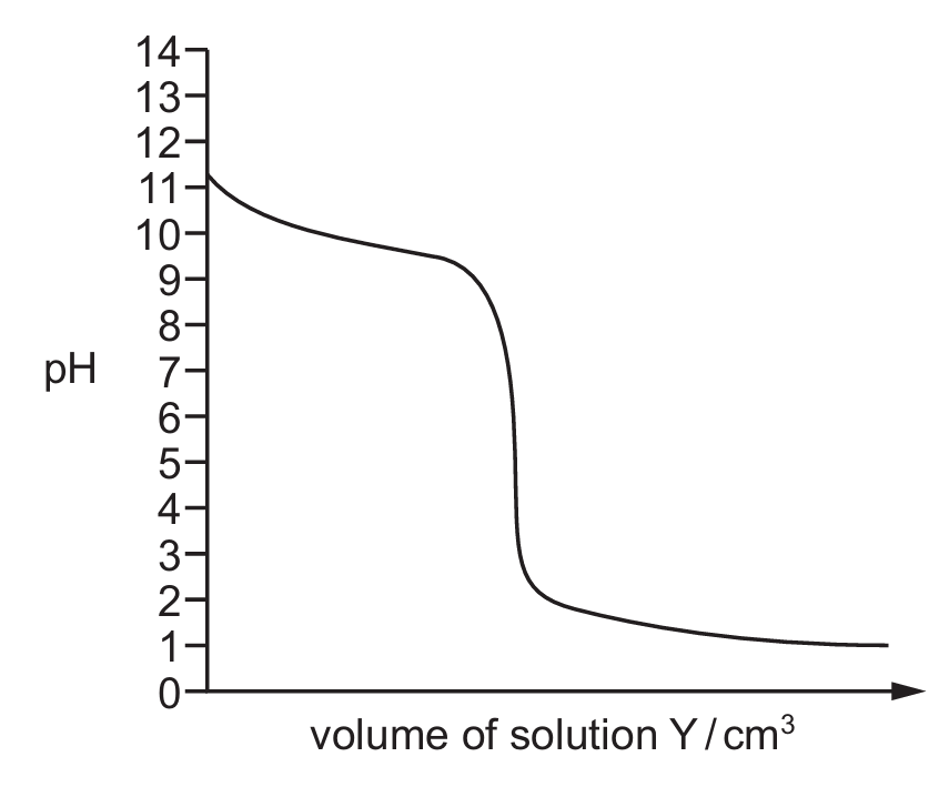 Solutions X and Y both have a concentration of 0.10 mol dm–3. A fixed volume of solution X is added to a conical flask, and solution Y is added from a burette to the conical flask. A titration is performed.