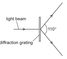 The grating has a line spacing of $1.0 × 10^{-6}m$. The angle between the two second-order maxima is 110°.
