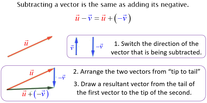 - Vector subtraction finds the difference between two vectors — equivalent to adding one vector to the negative of another.