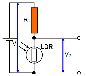 Two resistors (one is an LDR) connected in series across a voltage supply; output voltage taken across one resistor | As light intensity increases, LDR resistance decreases → voltage across LDR decreases → output voltage across other resistor increases. |