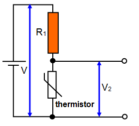 Two resistors (one is a thermistor) connected across a voltage supply; output voltage taken across one resistor | As temperature increases, thermistor resistance decreases → voltage across thermistor decreases → output voltage across other resistor increases. |