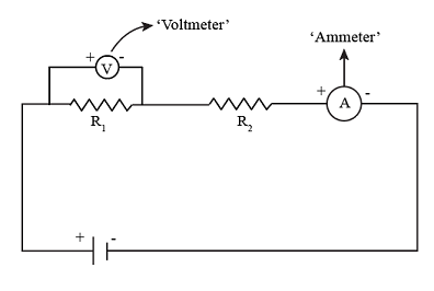 Battery → switch → resistor → ammeter in series → voltmeter connected across resistor | Used to measure the current through and potential difference across a resistor. The voltmeter is in parallel; ammeter is in series. |