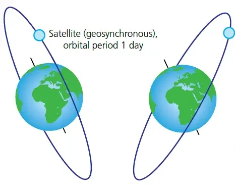 - understand that a satellite in a geostationary orbit remains at the same point above the Earth’s surface, with an orbital period of 24 hours, orbiting from west to east, directly above the Equator