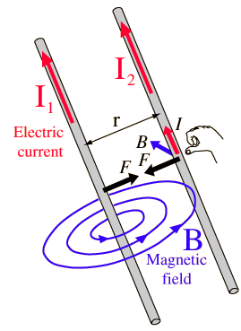 - explain the origin of the forces between current-carrying conductors and determine the direction of the forces