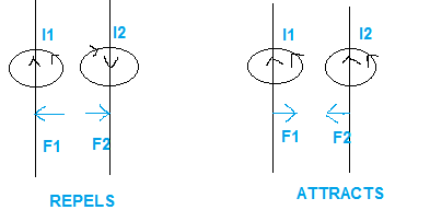 - Same direction currents produce magnetic fields that align between the wires → lower magnetic energy → attraction.