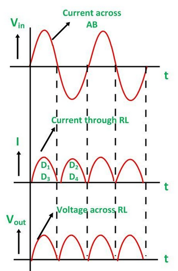 - Full-wave: \( \mathrm{V(t) = |V_0 \sin(\omega t)|} \) → No gaps; negative half is flipped.