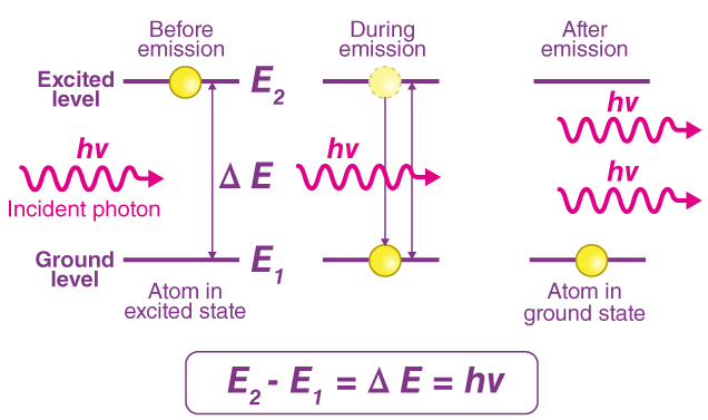 \( \mathrm{E = hf = E_{high} – E_{low}} \)