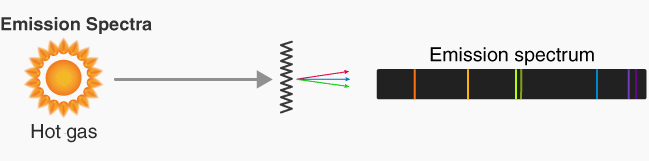 An emission line spectrum consists of bright, coloured lines on a dark background.