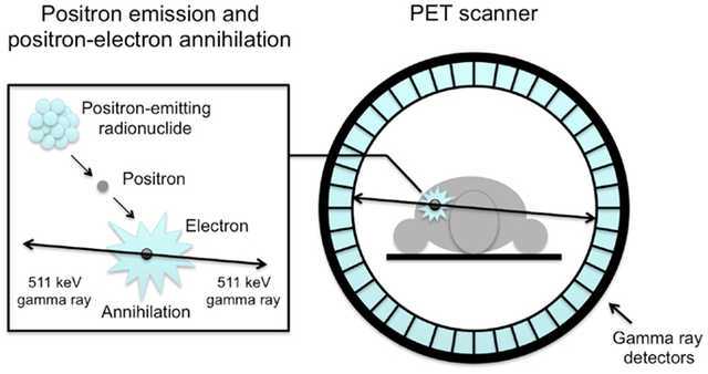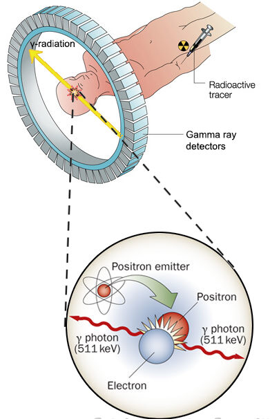 In PET scanning, the gamma-ray photons produced during positron–electron annihilation leave the body and are detected by a ring of external sensors. Using the arrival times and detection positions of these photons, a detailed image of tracer concentration inside the body is constructed.