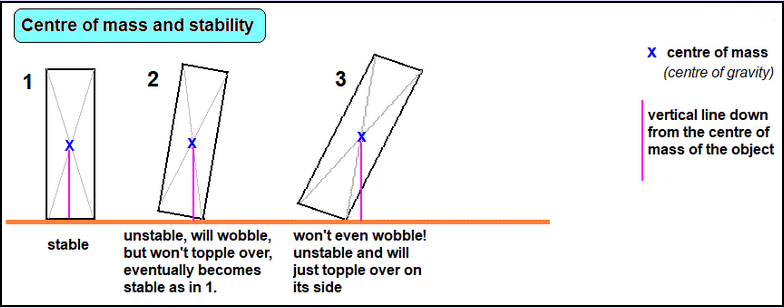 If the vertical line from the centre of gravity falls outside the base, the object will topple → Unstable.