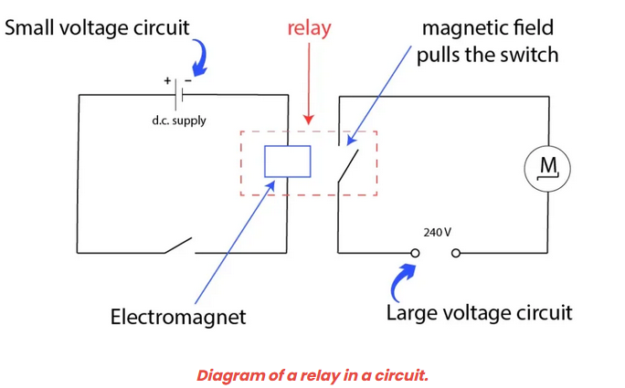 - Function: Electrically operated switch controlled by another current source (e.g., low voltage circuit triggering a high voltage one).