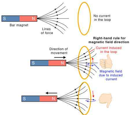 Example: If a north pole of a magnet is moved toward a coil, the induced current in the coil flows in a direction that creates a magnetic north pole facing the incoming magnet (to repel it).