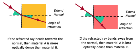 - When it enters a less dense medium, it speeds up and bends away from the normal.