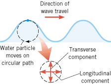 - In water waves, the surface particles move in a circular motion – a combination of up-down and back-forth.