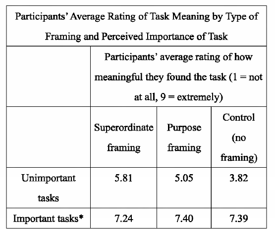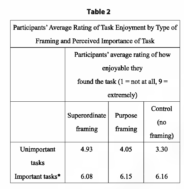 D. On average, participants in the superordinate-framing group gave higher ratings to both task meaning and task enjoyment for important tasks than did participants in the purpose-framing group.
