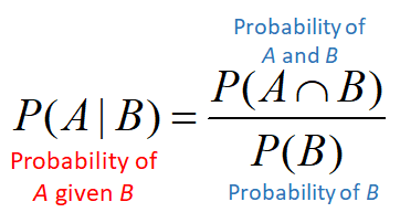 \( \mathrm{P}(\mathrm{A|B}) = \dfrac{\mathrm{P}(\mathrm{A\ and\ B})}{\mathrm{P}(\mathrm{B})} \)