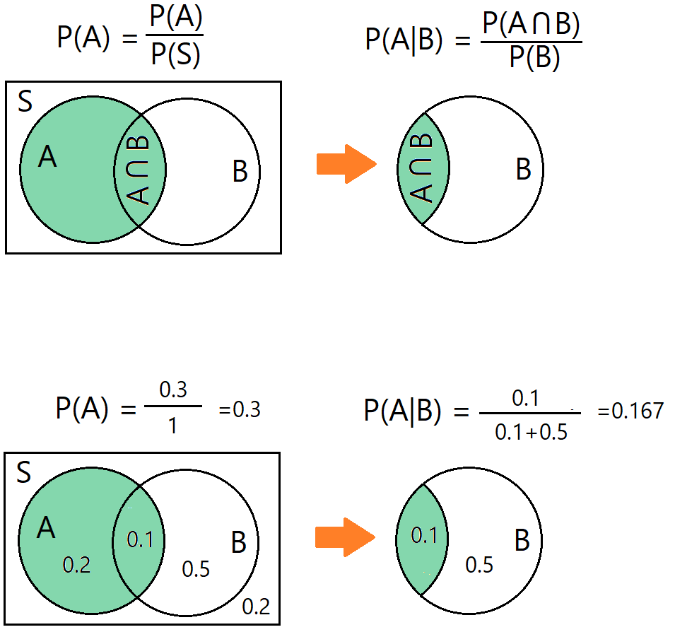 Important idea: once event B has happened, the sample space changes. You are no longer considering all outcomes, only the outcomes where B is true.