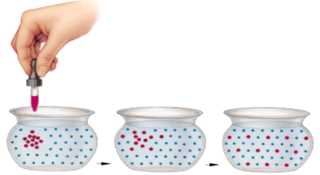 - Definition: The net movement of particles from an area of high concentration → low concentration, down a concentration gradient.