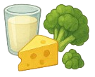 - Sources: Milk, cheese, yoghurt, leafy greens.