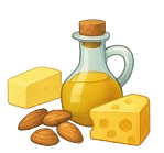 - Sources: Butter, cheese, oils, nuts, avocado.
