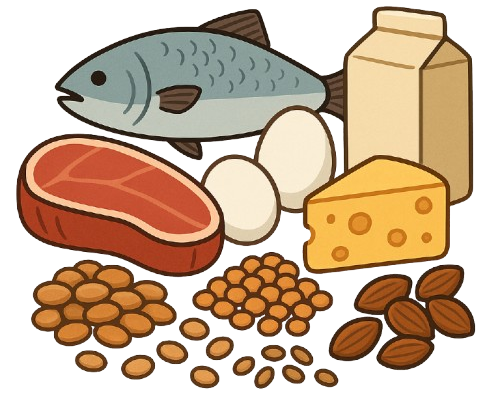 - Sources: Meat, fish, eggs, beans, pulses, dairy.