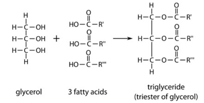 Lipids → 1 Glycerol + 3 Fatty acids → Triglyceride.