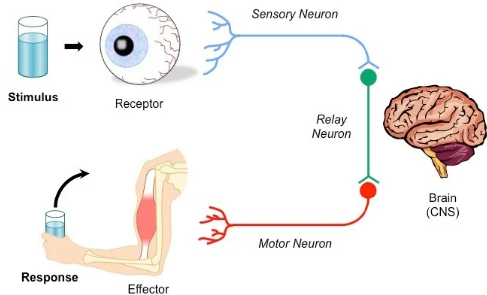 - Stimulus detected → receptors in sense organs detect a change (e.g., light, heat, pressure).