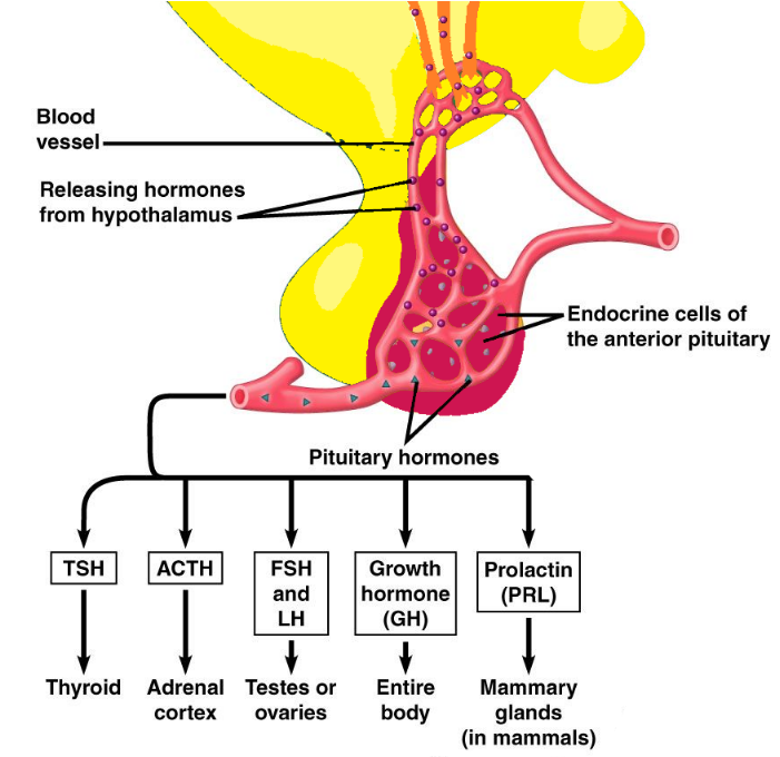 | LH | Pituitary gland (anterior) | Reproduction | Females: ovulation, corpus luteum formation; Males: testosterone production |