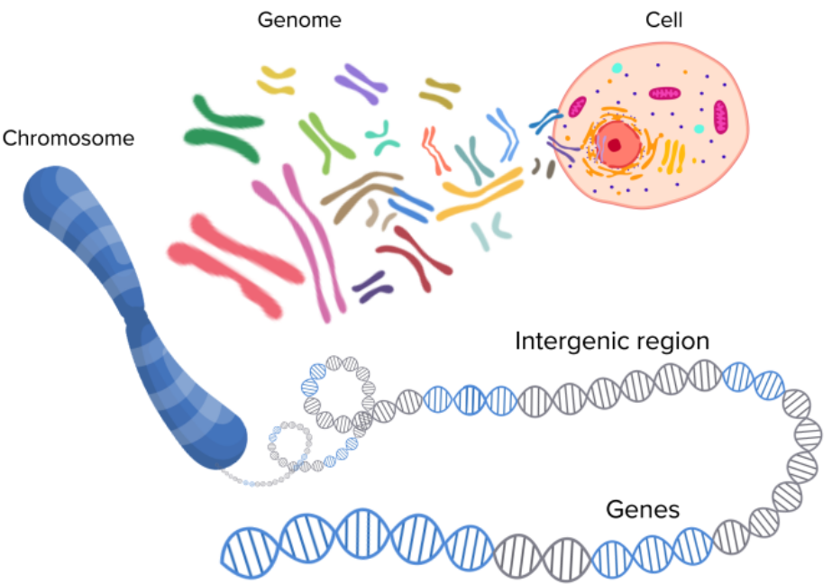 | Genome | Entire DNA of an organism | Contains all coding + non-coding DNA | Human genome = 23 pairs (~3 billion base pairs) |