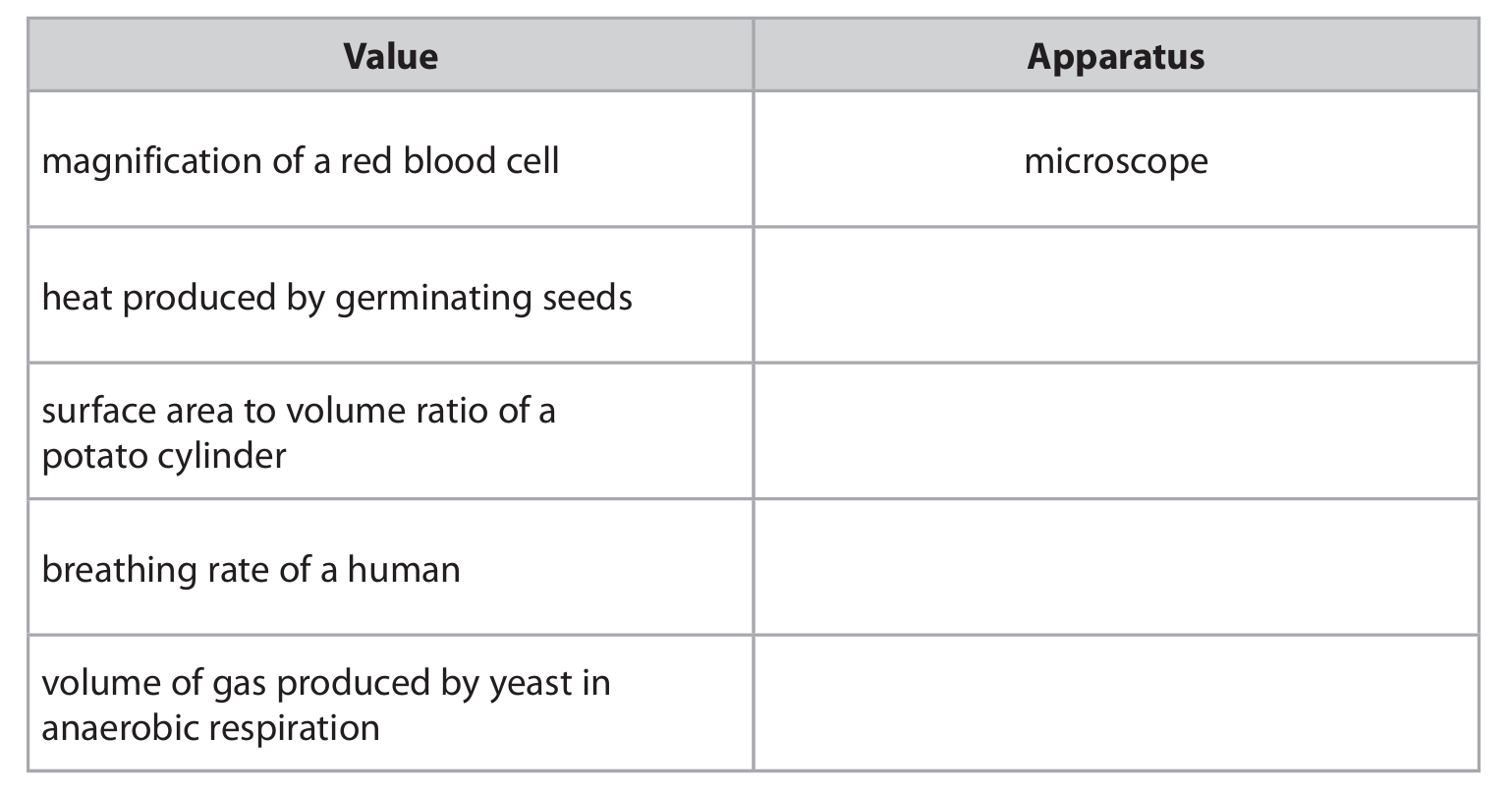 Explanation: To measure the heat produced by germinating seeds, a thermometer or temperature probe is used to detect the temperature change. For calculating the surface area to volume ratio of a potato cylinder, a ruler is essential to measure its length and diameter. To determine the breathing rate of a human, a timing device like a clock or watch is used to count breaths over a period, or a spirometer can measure lung volume changes. To measure the volume of gas produced by yeast during anaerobic respiration, apparatus like a syringe, measuring cylinder, or respirometer can collect and quantify the gas.