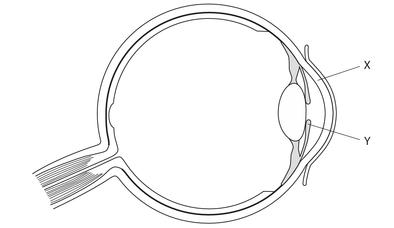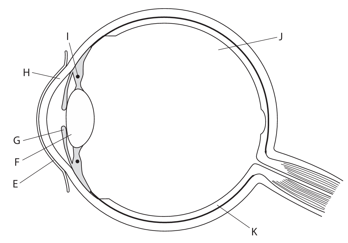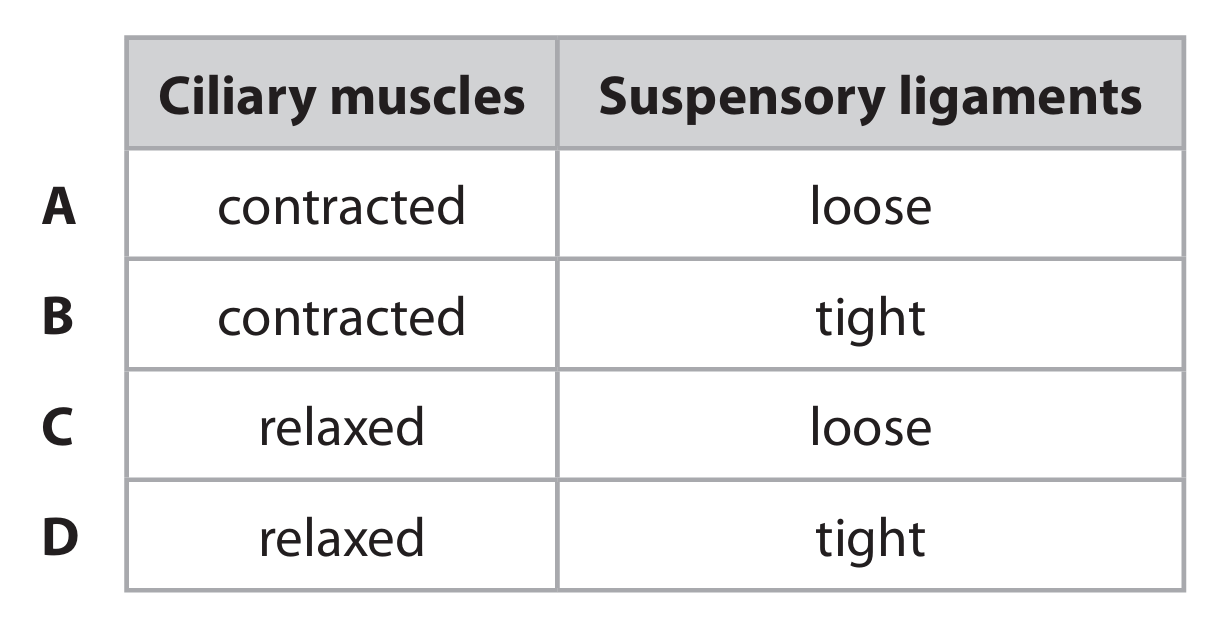 (a)(i) The cornea (C) refracts/bends light rays. The ciliary muscles (D) contract. This causes the suspensory ligaments to slacken. The lens (A) becomes more rounded/thicker, increasing its refractive power to focus light from near objects onto the retina.