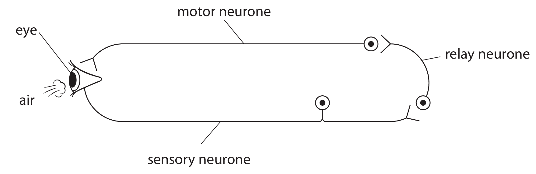 Explanation: This is an example of a reflex arc, which is an automatic, rapid response that doesn’t involve conscious thought. The pathway goes: receptor → sensory neurone → relay neurone (in spinal cord) → motor neurone → effector (muscle). This three-neurone system allows for quick protective responses to potentially harmful stimuli.