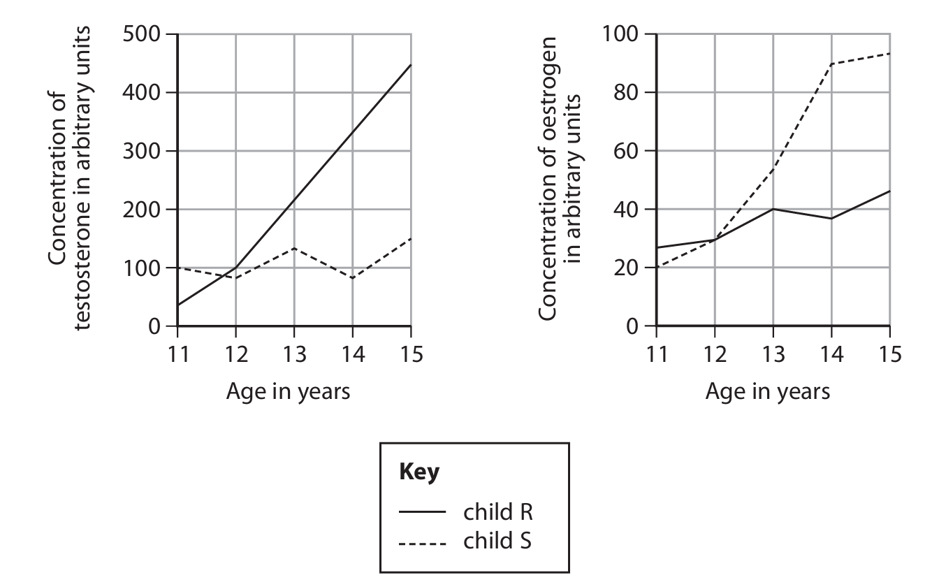 (c) The graphs show changes in the concentrations of the hormones testosterone and oestrogen in child R and in child S between the ages of 11 to 15.