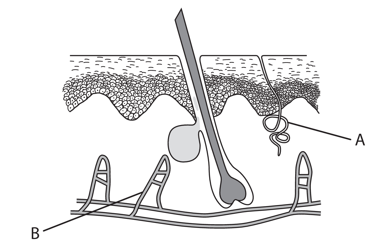 (c) Humans use their skin to regulate their body temperature. The diagram shows a section through the skin with two structures labelled A and B.