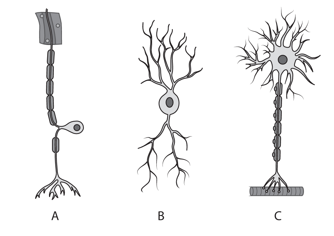 Explanation: Neurones are specialized nerve cells that transmit electrical impulses. Sensory neurones (A) carry impulses from receptors to the central nervous system. Relay neurones (B) are found within the central nervous system and connect sensory and motor neurones. Motor neurones (C) carry impulses from the central nervous system to effectors like muscles.