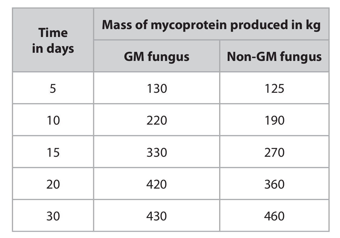 Explanation: To calculate the percentage increase, we use the formula: \[ \text{Percentage Increase} = \frac{\text{Mass from GM yeast} – \text{Mass from normal yeast}}{\text{Mass from normal yeast}} \times 100\% \] From the graph, after 1 day, the mass from GM yeast is approximately 2.2 g and from normal yeast is approximately 1.25 g. \[ \text{Increase} = 2.2 – 1.25 = 0.95 \text{ g} \] \[ \text{Percentage Increase} = \frac{0.95}{1.25} \times 100\% = 76\% \] Slight variations in reading the graph values can lead to answers between 69% and 80% being accepted.