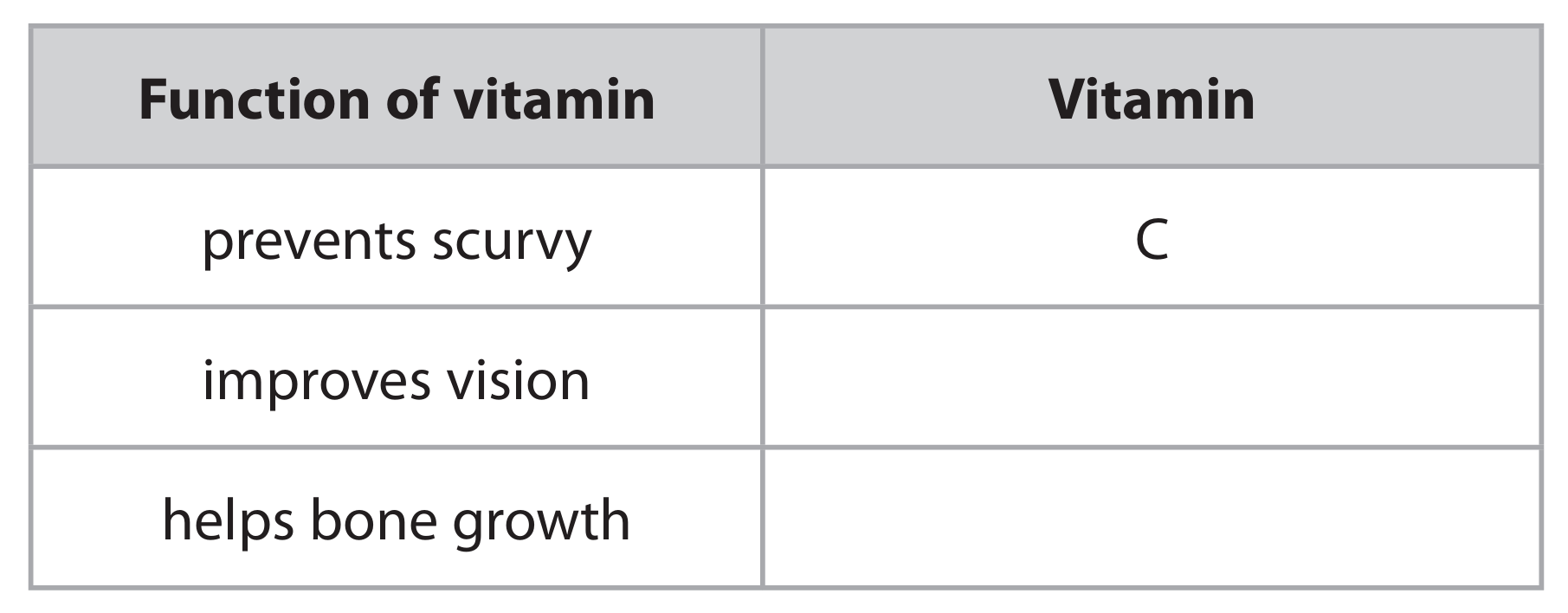 (a) (i) Vitamins and minerals are not listed in the table. Name one other component of a balanced diet that is not listed in the table.