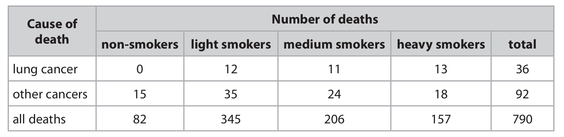 (ii) Calculate the difference in the percentage of all deaths caused by lung cancer in heavy smokers compared to the percentage of all deaths caused by lung cancer in light smokers.