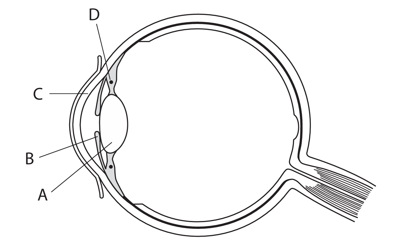 (a)(i) The cornea (C) refracts/bends light rays. The ciliary muscles (D) contract. This causes the suspensory ligaments to slacken. The lens (A) becomes more rounded/thicker, increasing its refractive power to focus light from near objects onto the retina.