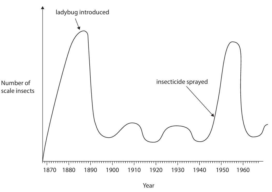 (i) Discuss the effects that the introduction of ladybugs, and the use of insecticides, has on the numbers of scale insects.